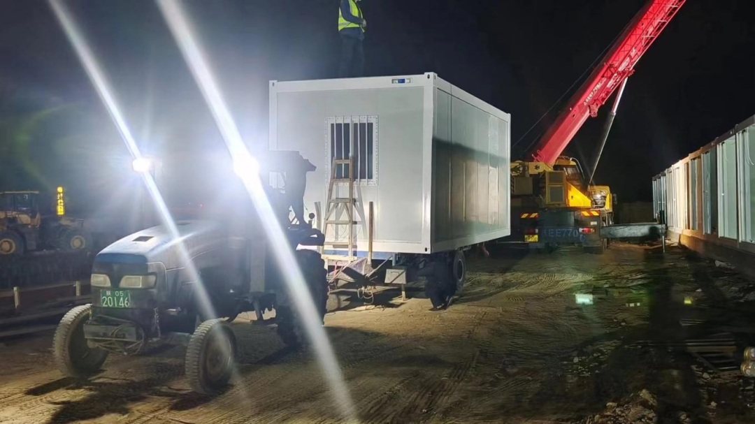 開工初期,全國范圍內(nèi)的疫情肆虐嚴(yán)重影響了建筑材料的運(yùn)輸,各地中高風(fēng)險區(qū)大量方艙醫(yī)院需求又造成了整個箱房行業(yè)的嚴(yán)重缺貨,對我司的備貨供貨能力提出了嚴(yán)峻考驗,按照潼關(guān)縣防疫政策要求,自4月8日起外地車輛和人員實行勸返政策,打包箱,門窗等重要原材料以及負(fù)責(zé)管道、電纜的施工隊伍都沒能按時進(jìn)入施工現(xiàn)場......面對困難,不等不靠,主動出擊,是陜建人的鐵血作風(fēng),在雙重壓力下,項目負(fù)責(zé)人連夜召集相關(guān)人員召開緊急會議集中破解難題,會議部署:一是尋求潼關(guān)縣政府相關(guān)部門協(xié)助建設(shè)物資運(yùn)輸,在不違反防疫原則,嚴(yán)格做好疫情防控的前提下,實行特事特辦,專事專辦,公司提前報備運(yùn)輸行程,制定專門的運(yùn)輸路線進(jìn)行點(diǎn)對點(diǎn)運(yùn)輸,定時定點(diǎn)消殺,嚴(yán)防因項目施工導(dǎo)致的疫情傳播;二是千方百計調(diào)配原材料,公司廠內(nèi)現(xiàn)有庫存原料全部用于支持潼關(guān)項目,剩余缺口全公司調(diào)用一切資源協(xié)調(diào),必須保障項目順利實施。定了就干,說了就辦,會議精神迅速落實,每個環(huán)節(jié)、每項任務(wù)全部精確歸責(zé)落實到人,隨著各項任務(wù)不斷執(zhí)行到位,項目建設(shè)開啟了“加速鍵”, 4月9日早上6點(diǎn),打包箱材料運(yùn)到了現(xiàn)場,早上7點(diǎn),專業(yè)的施工隊伍到達(dá)現(xiàn)場,當(dāng)日,第一批材料也及時到達(dá)現(xiàn)場,同時抵達(dá)的還有從行業(yè)內(nèi)調(diào)配的整套箱房材料,4月10日凌晨,施工現(xiàn)場燈火通明,塔吊林立,機(jī)器轟鳴,箱式房吊裝作業(yè)正式啟動,四月的深夜依然寒意凜凜,但每個參建者卻汗流浹背,斗志昂揚(yáng)......