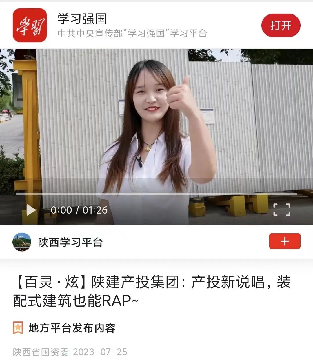 該作品用說唱的全新表現(xiàn)形式,展現(xiàn)了集團(tuán)建筑全產(chǎn)業(yè)鏈的產(chǎn)業(yè)布局,通過快節(jié)奏的音樂律動(dòng)介紹了產(chǎn)品特色,彰顯了集團(tuán)富有激情、勇于創(chuàng)新的員工風(fēng)采。該作品發(fā)布之后,獲得了良好的傳播效果,被陜西省國(guó)資委轉(zhuǎn)載至《學(xué)習(xí)強(qiáng)國(guó)》平臺(tái)。